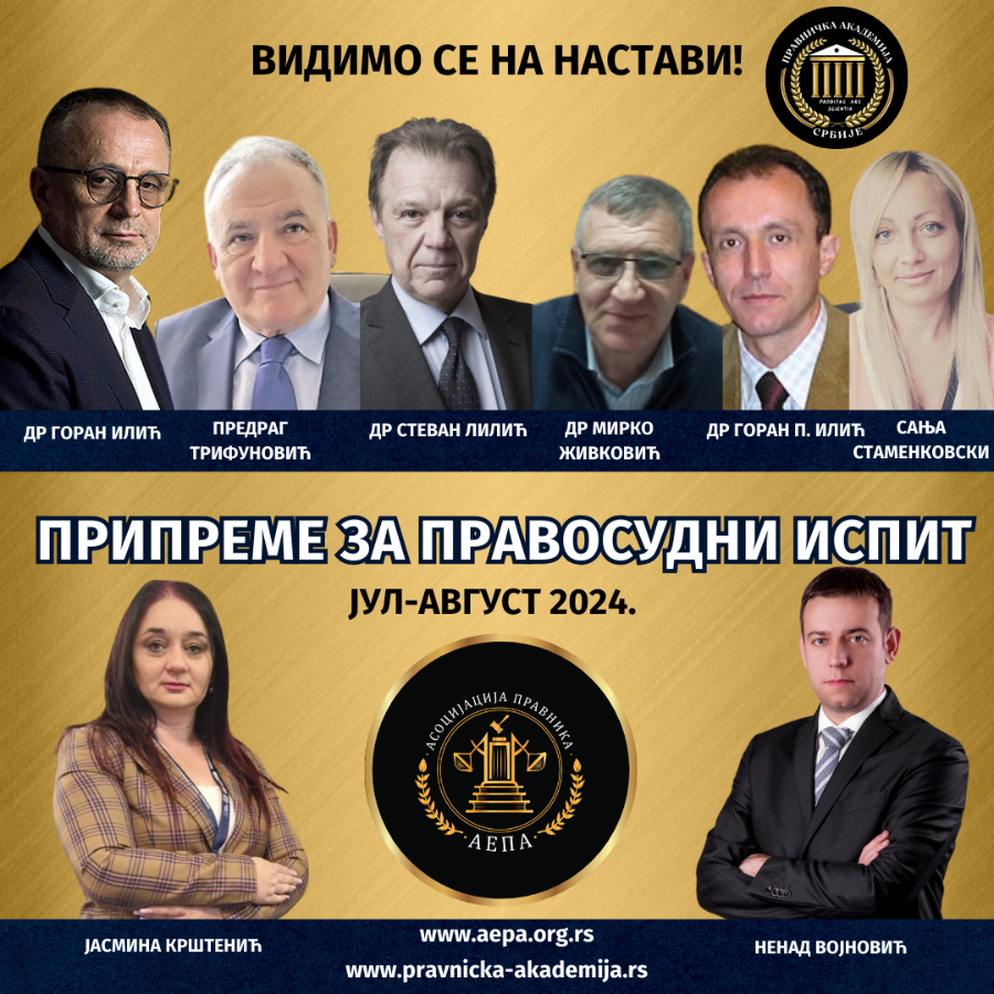 Asocijacija pravnika AEPA i Pravnička akademija Srbije, u saradnji sa Srpskim pravničkim društvom, organizuju pripremnu nastavu za polaganje pravosudnog ispita u periodu od jula – avgusta 2024. godine, online (Zoom app).