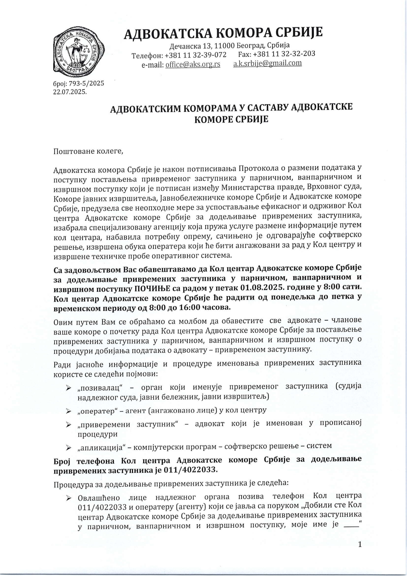 Kol centar (call centar) Advokatske komore Srbije za dodeljivanje privremenih zastupnika u parničnom, vanparničnom i izvršnom postupku počinje sa radom u petak 01.08.2025. godine, u 8.00 časova.